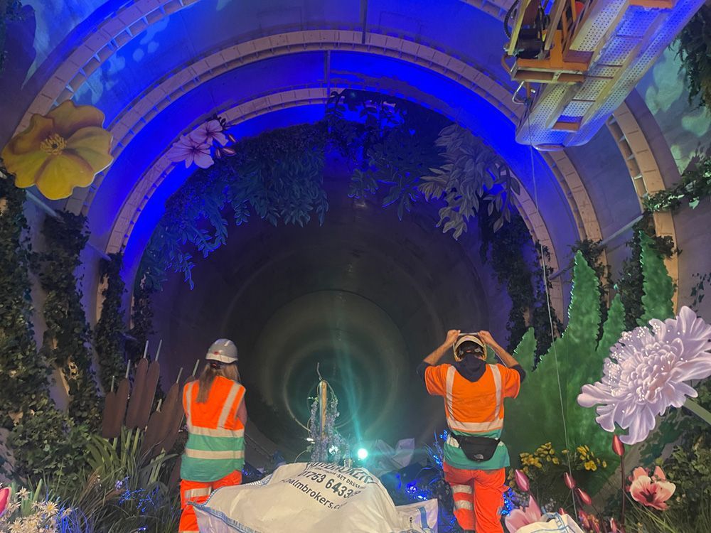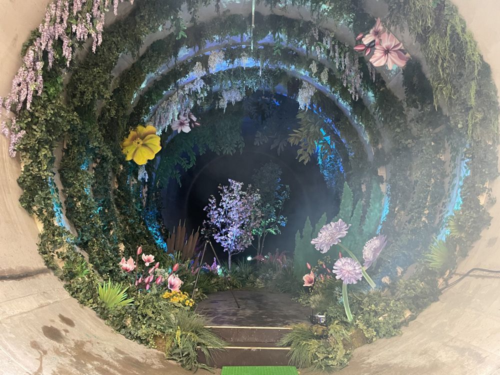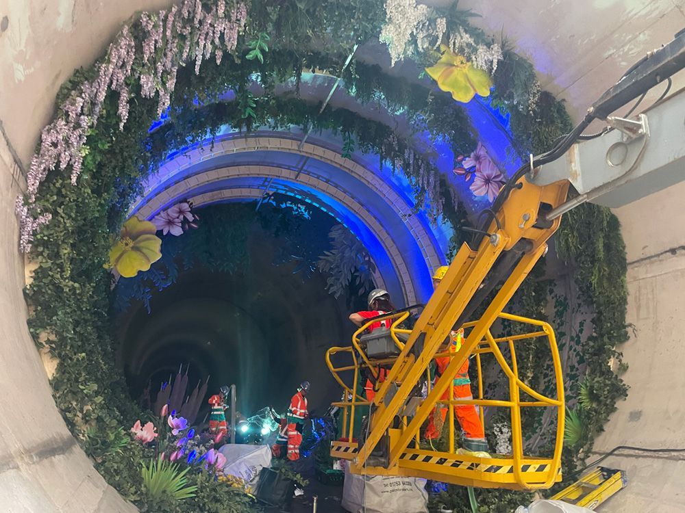 When we were asked in June 2023 to help with the launch of London’s Super Sewer we jumped at the chance of working on this unique project. We were asked to supply lighting and sound 60 metres underground in an 8m diameter tunnel to mark the final phase of the building of the new sewer. Known as The Loo Gardens it consisted of trees, plants and shrubs complete with our uplighters and a PA system to play a looped track of birds sounds. Guests were then brought down over a two week period to see the sewer and understand the environmental benefits this will bring to London.
